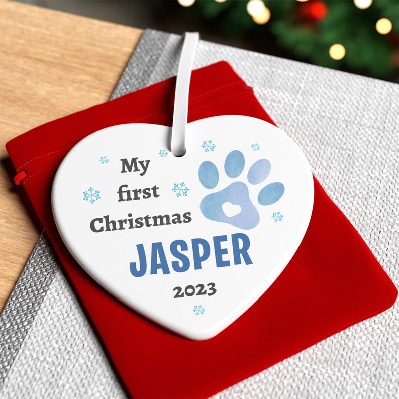 Dogs First Christmas Ceramic Bauble Decoration, Personalised Dog Bauble, Puppy's First Christmas Bauble Ornament, Pet Gift With Red Bag